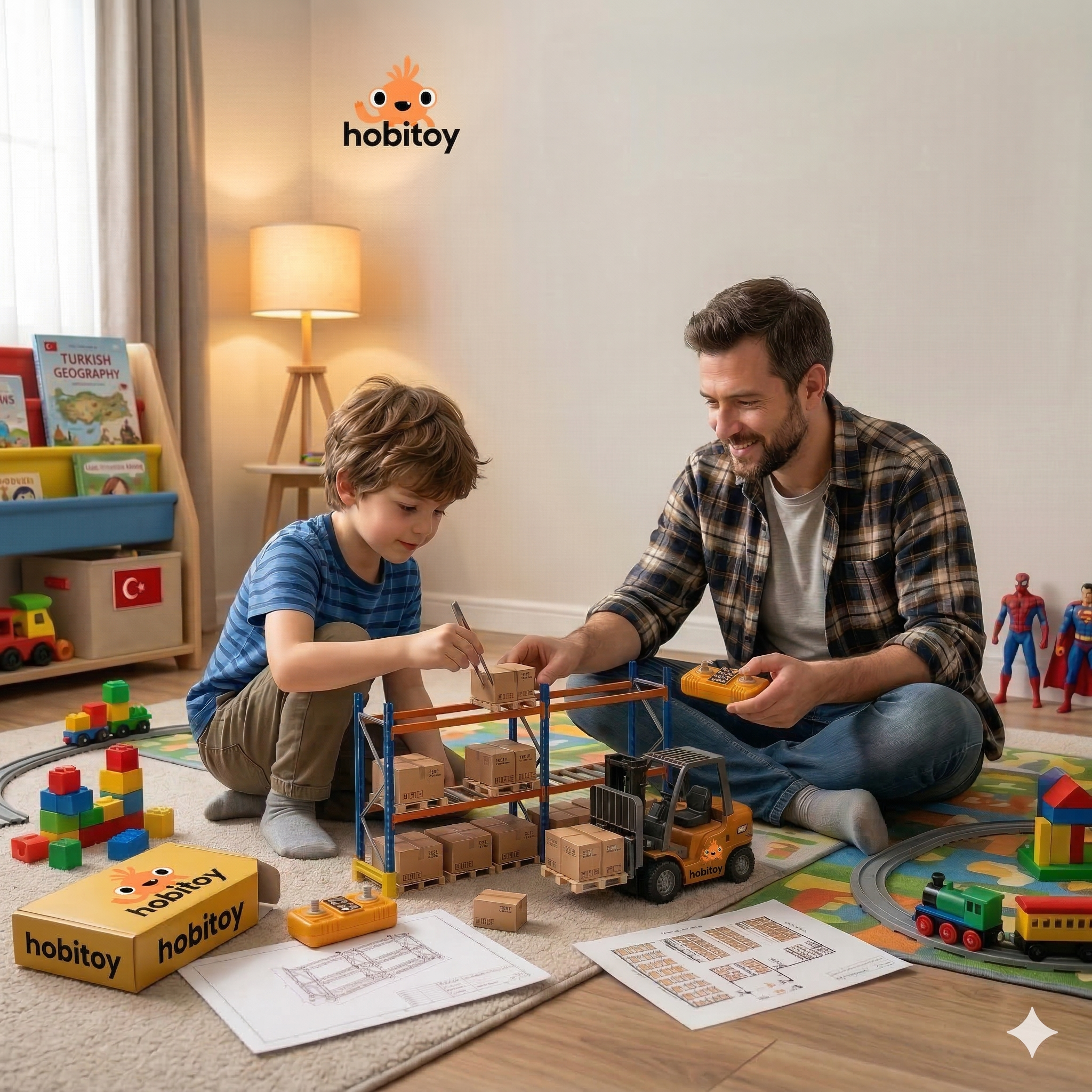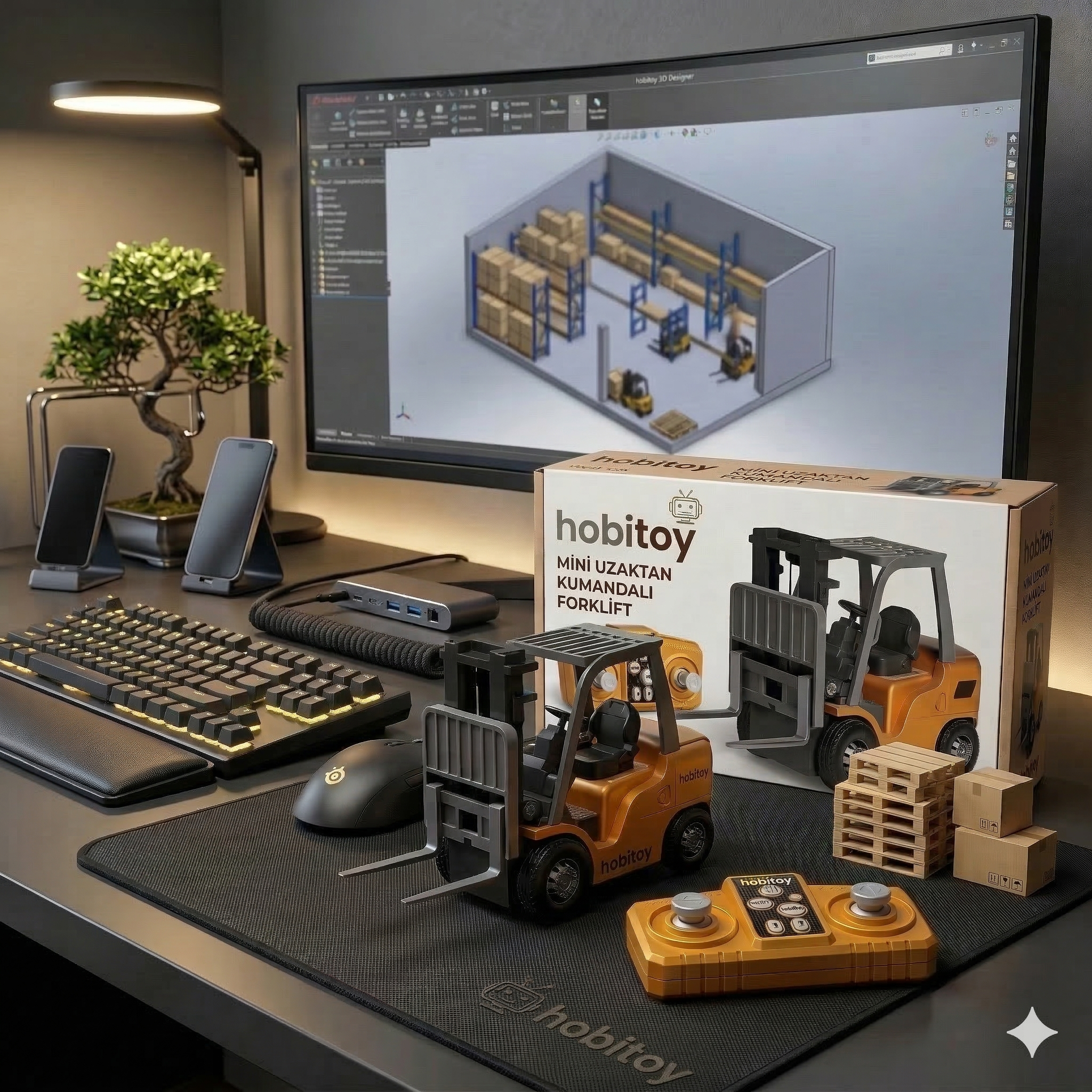 Hobitoy Mini Forklift ile masanda kendi küçük lojistik dünyanı kur. Yükleri kaldır, indir ve taşı.